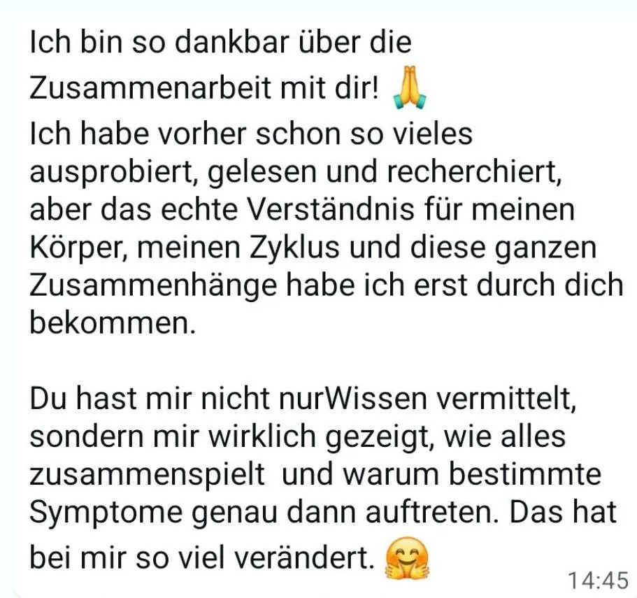 Frauen, die mit mir zusammenarbeiten, verstehen zum ersten Mal, was wirklich in ihrem Körper passiert und erleben, wie viel leichter ihr Alltag dadurch wird.